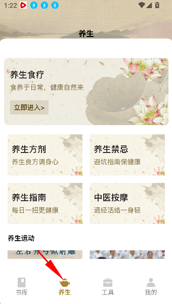 2、点击“养生”选项,即可进入养生专题页面,其中详细介绍了古代养生典籍中的各种保健方法,如食疗技巧和气功练习等实用内容。