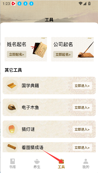 3、通过访问“工具”板块,可以发现如看图猜成语互动游戏,通过图像猜测成语含义以增强趣味性,同时提供国学典籍的快速查询和检索功能。