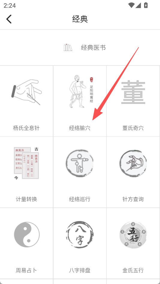 1、“经典”板块下各功能模块的图标与名称对应直观,分类清晰,能快速定位到想要学习的中医内容。