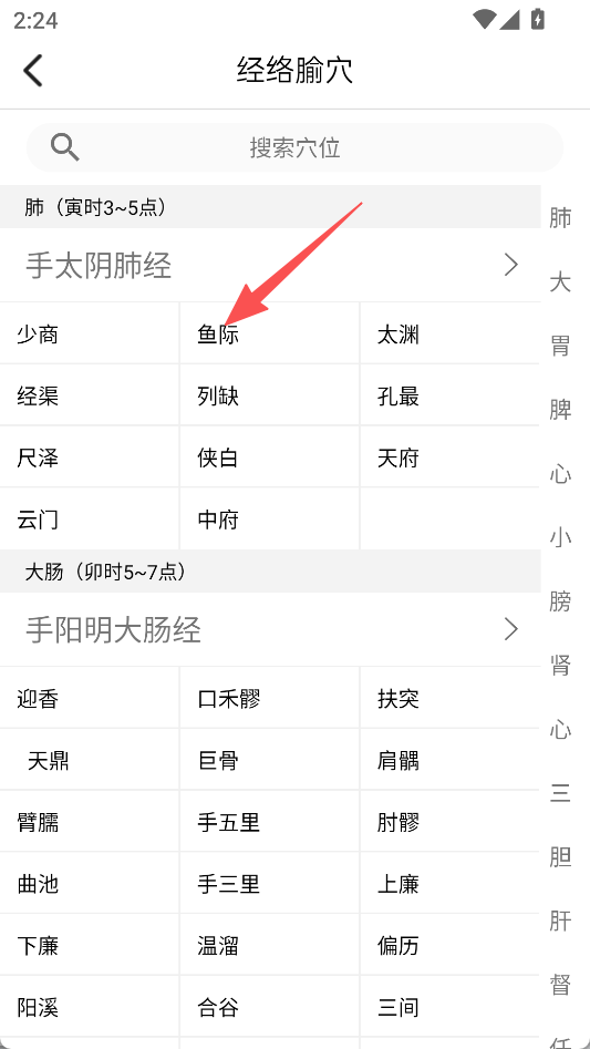 2、在经络腧穴页面,选择穴位(如鱼际)。