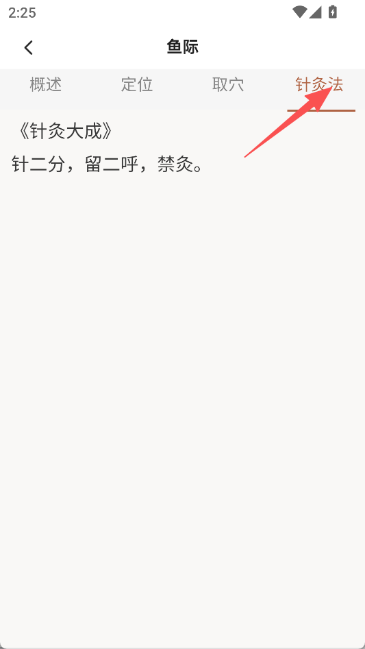 3、进入穴位详情页,点击 针灸法,查看针灸相关内容。