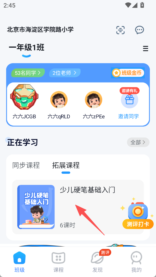 1、打开六六写字,在班级页面点击“少儿硬笔基础入门”拓展课程。