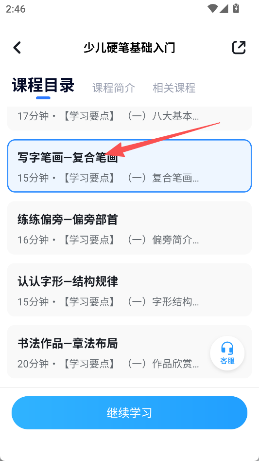 2、进入课程后,选择“写字笔画-复合笔画”章节。