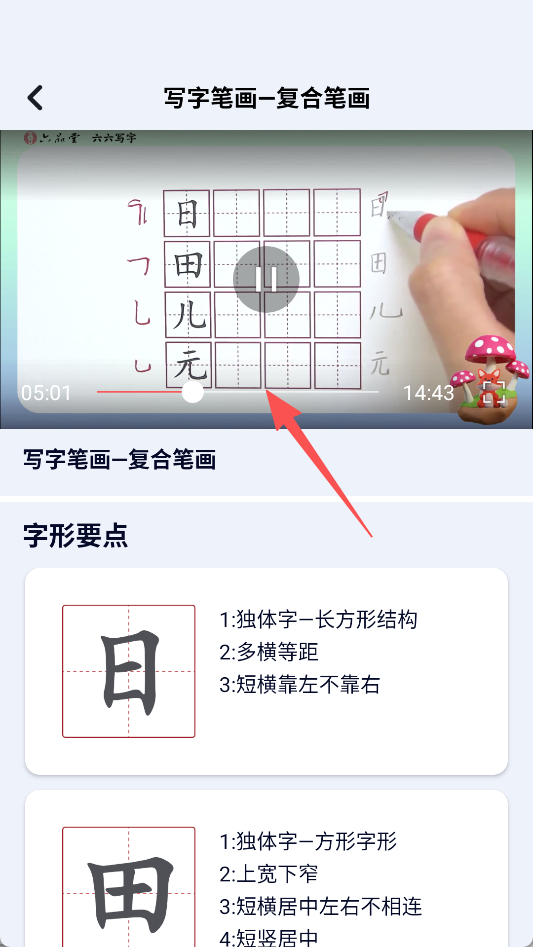2、单个汉字教学融合动态书写演示与字形要点解析,直观呈现书写过程,精准讲解关键知识。
