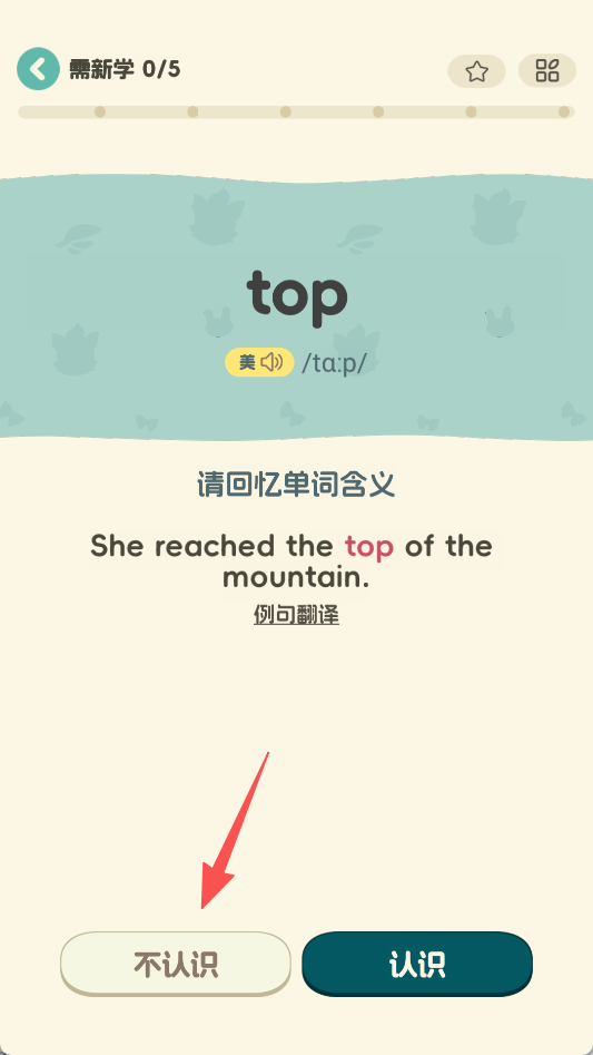 2、在单词学习页,根据对单词的记忆,点击“不认识”或“认识”。