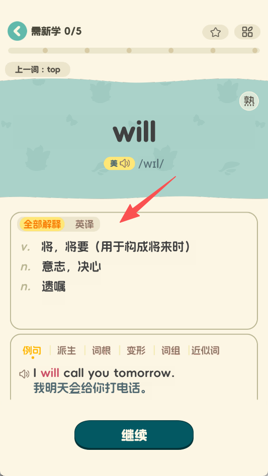 3、查看单词的全部解释、例句等内容后,点击“继续”,学习下一个单词。