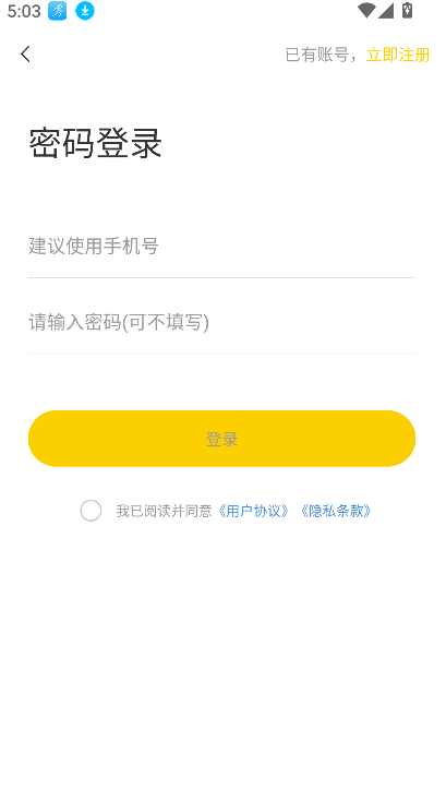 3、在密码登录页面,依次完成输入个人手机号码、设置账户密码、勾选同意用户协议与隐私政策等步骤。