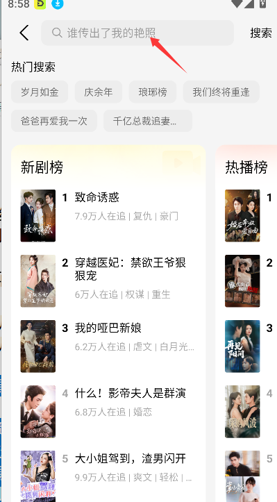 2、应用顶部的显眼位置找到放大镜形状的搜索框图标并点击,输入意向小说的书名或作者名。