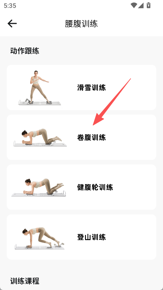 1、进入腰腹训练页面,选择“卷腹训练” 等动作跟练选项。