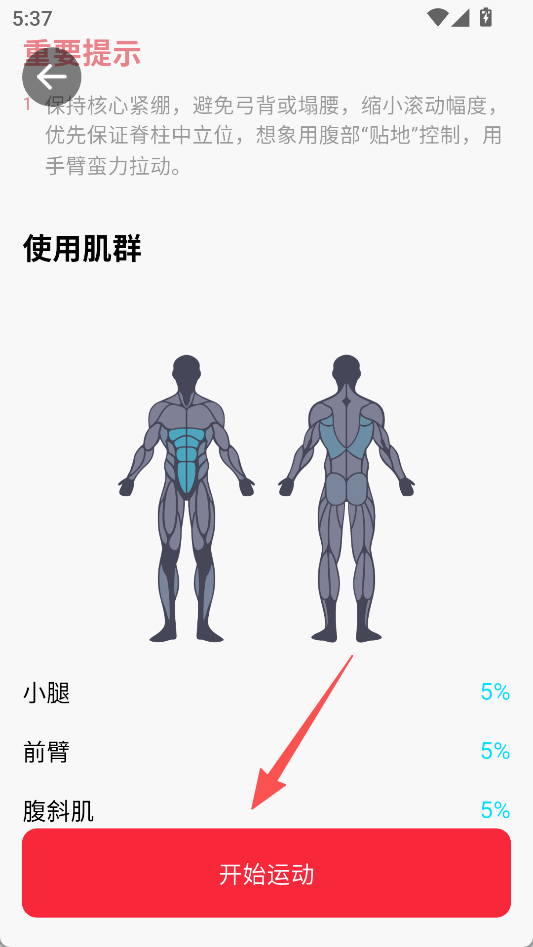 2、在动作详情页,查看重要提示和使用肌群,点击“开始运动”。