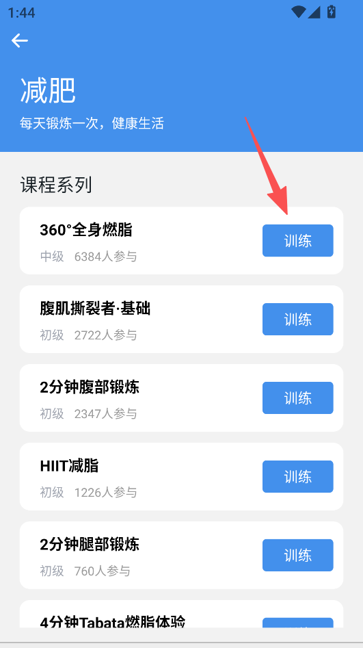 2、在减肥课程页面,选择课程,点击右侧“训练”。