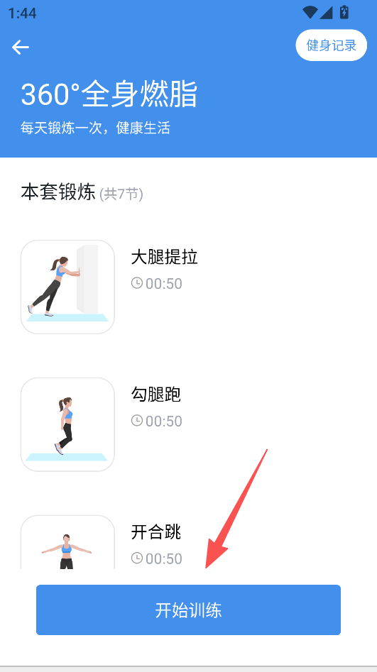 3、支持开始训练,在课程详情页点击“开始训练”,跟随拆分的动作(如大腿提拉、开合跳等)进行锻炼。