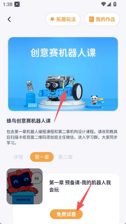 1、进入蜂鸟创意赛机器人课,点击免费试看,可开启机器人课程的初步学习。