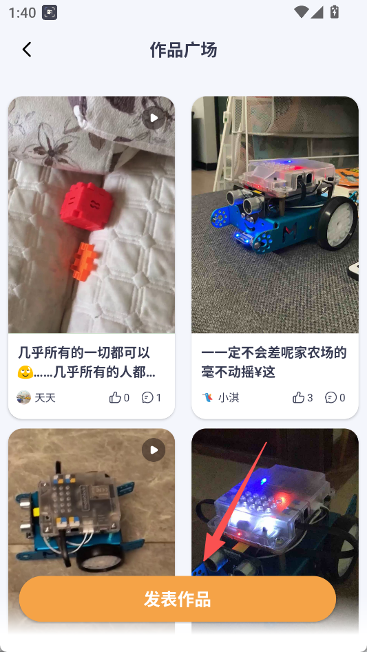 3、进入作品广场,点击发表作品,可将自己的机器人创作分享给其他人。