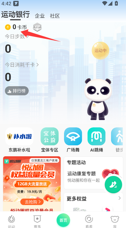 1、在首页界面顶部找到并点击显示步数统计的「今日步数」区域。