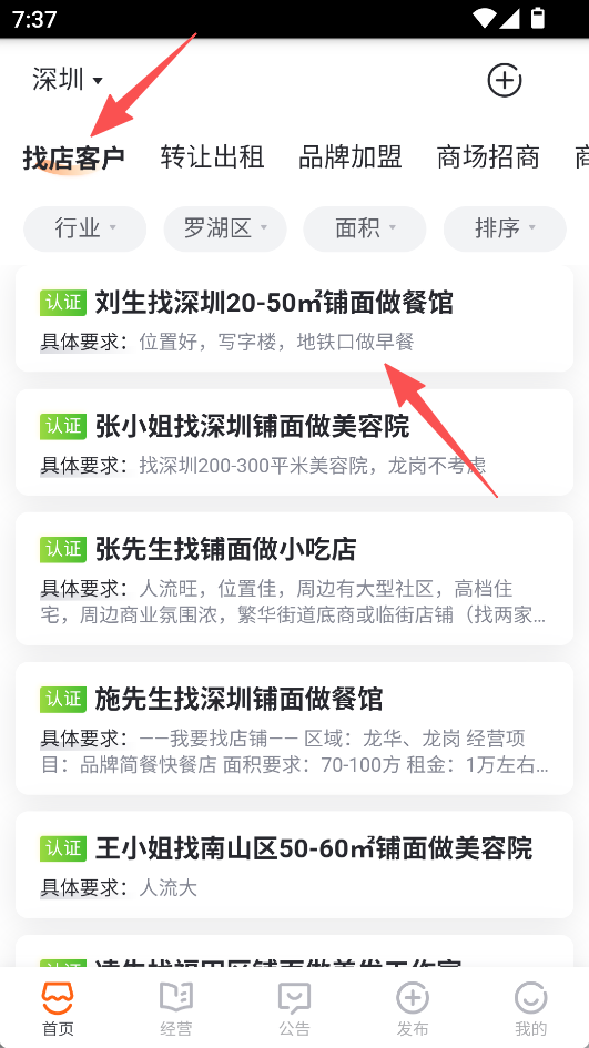 1、在找店客户板块,可浏览不同用户的找铺需求,查看面积、行业、位置等具体找铺条件。