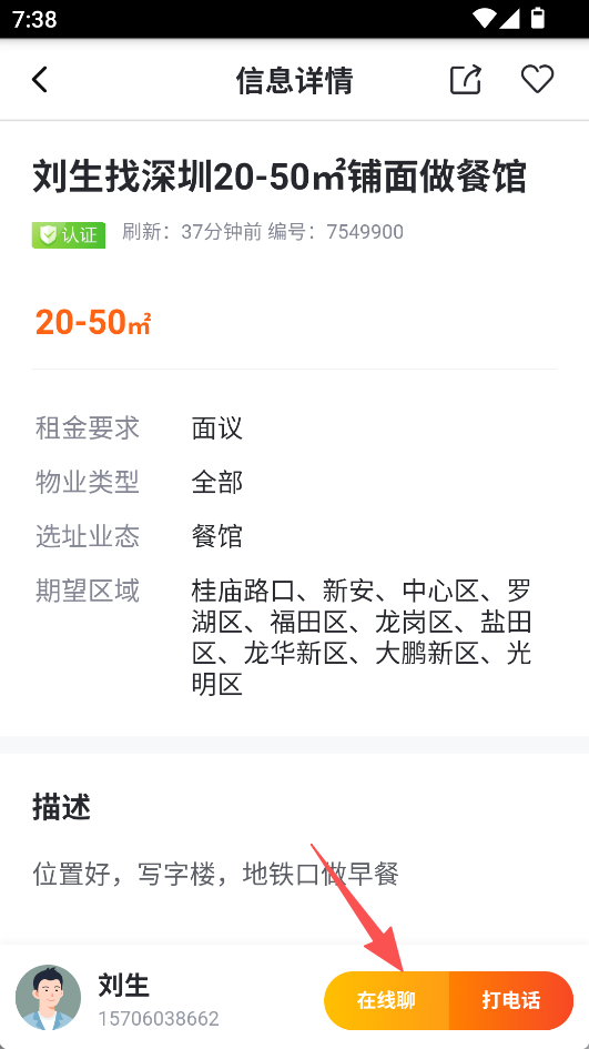 2、点击找铺信息进入详情页,能通过在线聊或打电话的方式,与发布需求的用户进行对接。