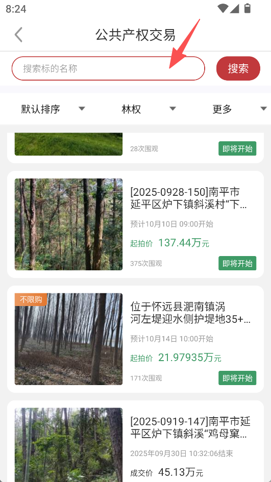 2、产权交易板块支持标的名称搜索,可呈现林权等各类产权交易项目的起拍价、时间等详细信息,信息维度全面。