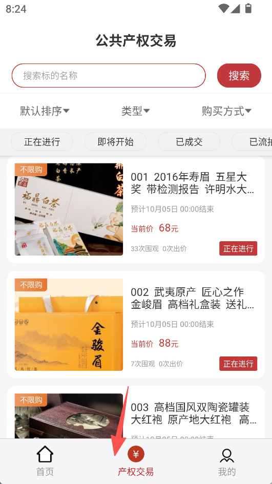 3、可查看产权交易项目的起拍价、时间等信息,也能查看正在进行的拍卖品,参与公共产权交易与拍卖。
