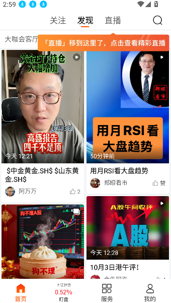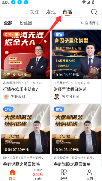 2、点击底部导航栏的“直播”按钮,即可进入直播间观看财经专家对实时股市行情的分析与评论。