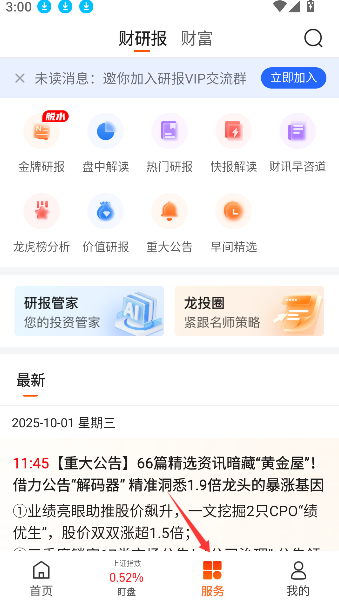 3、在“服务”板块中,能够查阅包括金牌机构研报、盘中实时动态解读在内的一系列深度资讯。