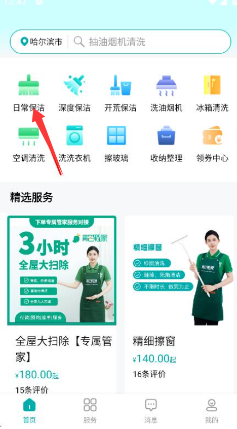 1、找到并点击“日常保洁”选项,进入展示该服务具体内容与价格的详情页面。