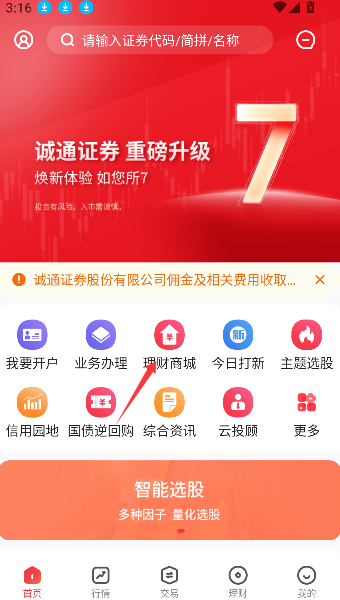 1、打开《诚通证券》应用,在首页或功能列表中找到并点击“理财商城”选项,进入产品展示页面。
