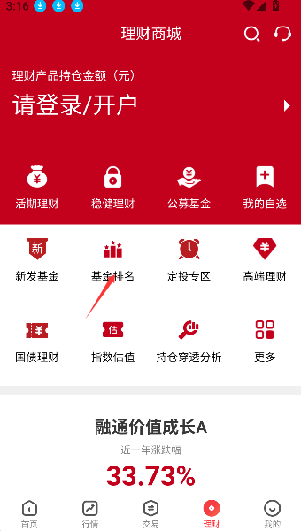 2、在理财商城页面中,找到并选择“基金排名”功能入口,进入按业绩或分类排序的基金列表界面。