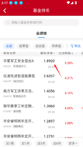 3、在基金排名列表中,通过浏览或搜索找到“华夏军工安全混合A混合”这只基金,点击查看其详细信息,进行购买。
