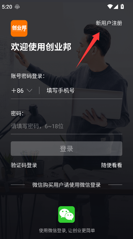 3、 在登录注册界面中,选择“新用户注册”选项,即可进入以手机号验证为核心流程的账户注册页面。