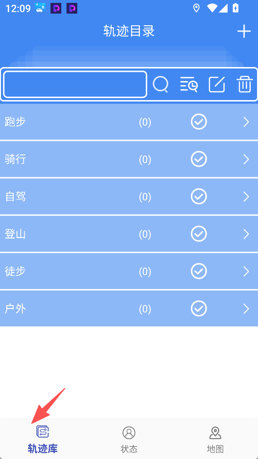 1、打开分享轨迹,点击“轨迹库”,查看跑步、骑行等分类轨迹。