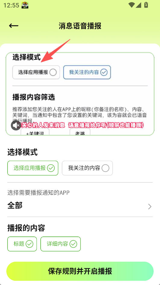 1、聚焦消息语音播报的灵活设置,可选择应用播报或关注内容模式,还能筛选播报内容、选定需播报通知的APP。
