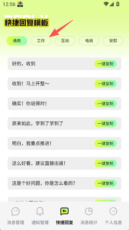 2、侧重快捷回复的场景化覆盖,提供通用、工作、互动等多类模板,每个分类下有适配不同沟通场景的回复语。