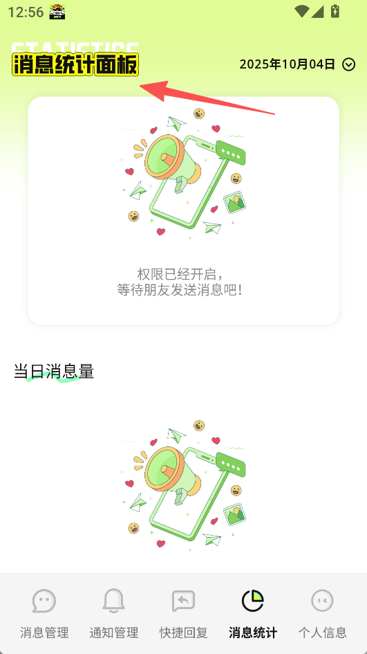3、消息统计面板直观明了,能快速查看当日消息量等关键数据,权限开启后可实时等待并统计消息,数据展示清晰。