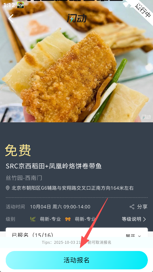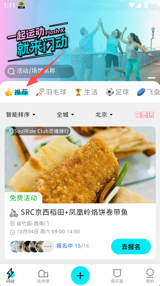 1、打开闪动,在首页选择分类或搜索,找到心仪活动点击“去报名”。