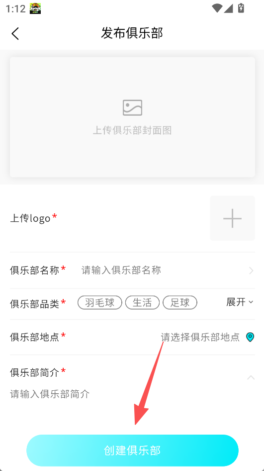 2、支持发布俱乐部,填写封面图、logo、名称、品类、地点、简介等信息,点击“创建俱乐部”完成发布。