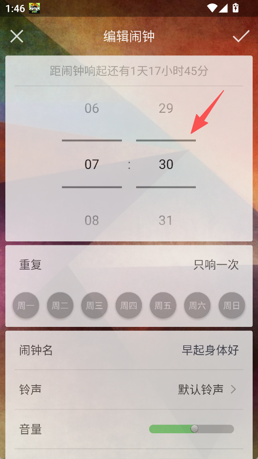 1、可编辑闹钟,设置响铃时间、重复周期,填写闹钟名,选择铃声并调节音量。
