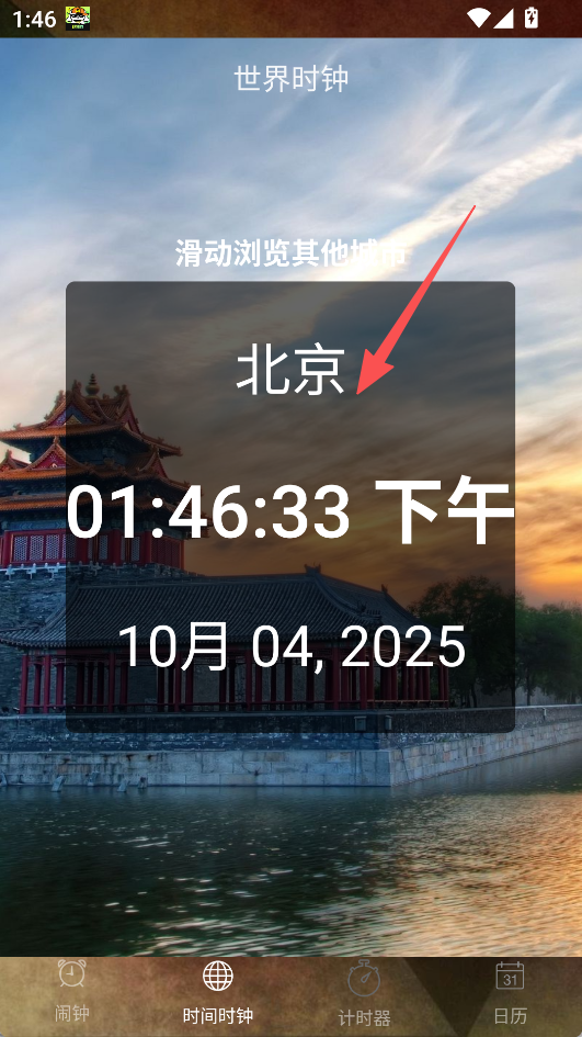 2、世界时钟展示直观,能清晰查看不同城市时间,通过滑动操作即可浏览其他城市,方便了解全球时间。