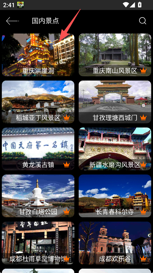1、景点展示丰富,国内景点板块涵盖多样知名景点,从重庆洪崖洞到稻城亚丁 ,提供多方位实景画面。