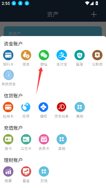 2、在账本页面的右上方,点击加号形状的添加按钮,会弹出选择账户类型的浮层菜单。