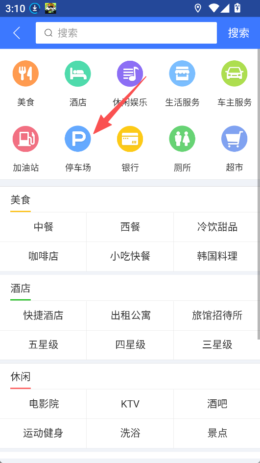 2、周边查找便捷,各类场所分类明确,可快速定位到美食、停车场等,节省查找时间。