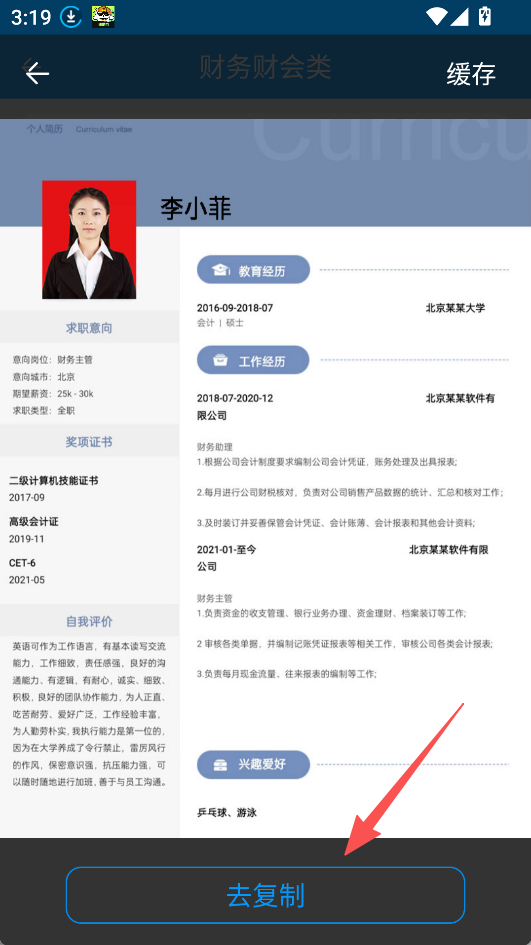 3、查看简历详细内容,点击“去复制”借鉴制作简历。