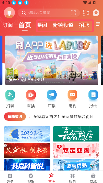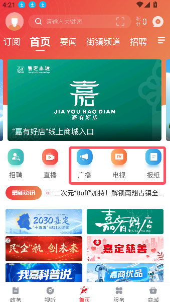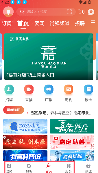 3、通过底部功能栏可切换至“政务”、“视听”、“商城”等主要服务模块,获取相应服务内容。