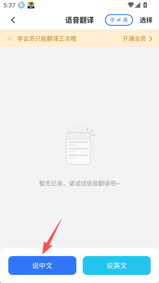 3、支持语音翻译,进入语音翻译界面,点击“说中文”或“说英文”按钮,进行语音翻译操作。