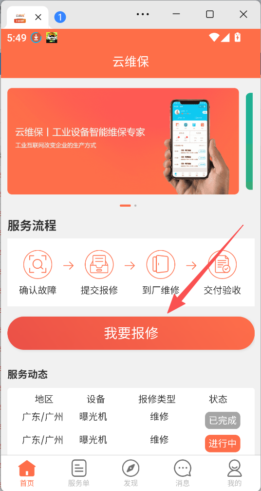 3、报修功能便捷,设有“我要报修”按钮,方便快速发起工业设备报修,同时能查看服务动态了解报修状态。