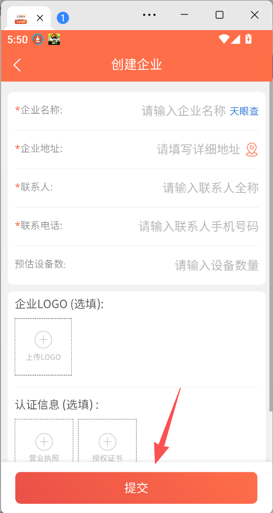 2、进入创建企业界面,填写企业信息,点击“提交”创建企业。