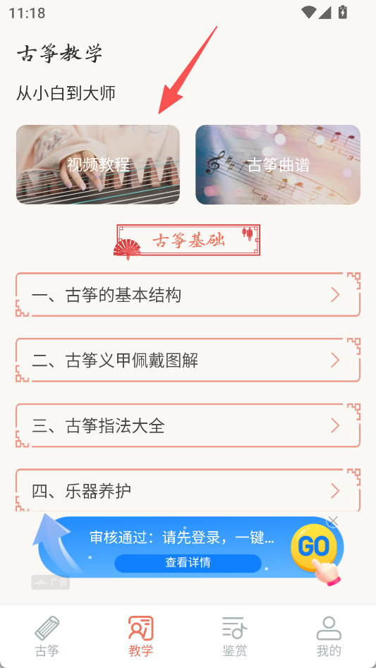 1、打开《知音古筝》,进入教学板块,可选择视频教程或古筝曲谱。