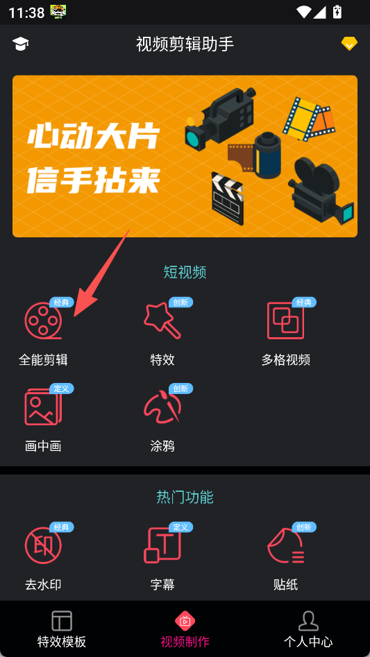 《视频剪辑助手》是一款便捷的视频剪辑制作软件,能让用户轻松打造心动大片。它功能丰富,有全能剪辑可对视频进行截取等操作,还有特效、多格视频、画中画、涂鸦等创意功能,热门功能里的去水印、字幕、贴纸也很实用。同时支持添加音频,为视频增添合适音效或配乐,操作简单易上手,满足用户多样的视频剪辑创作需求。
