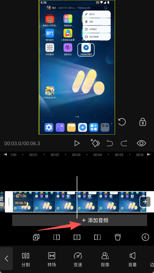 2、在剪辑界面,可点击“添加音频”,为视频添加合适的音效或配乐。