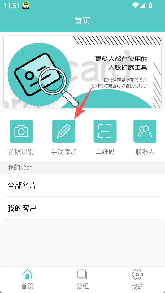 1、首页可选择“拍照识别”或“手动添加”录入名片。